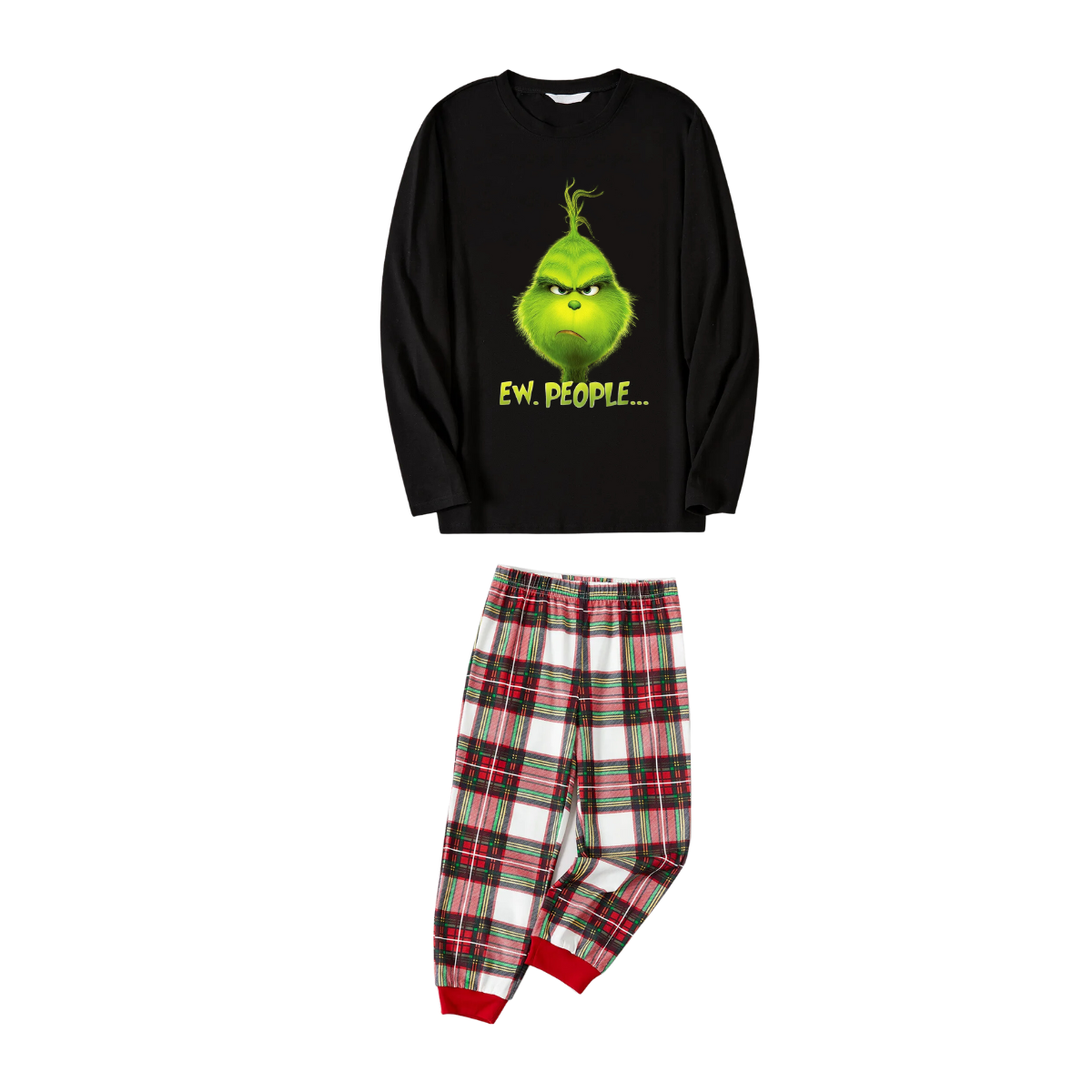 Christmas Cartoon Pattern Print Black Long Sleeve Top with Red & White & Green Plaid Matching Family Pajamas