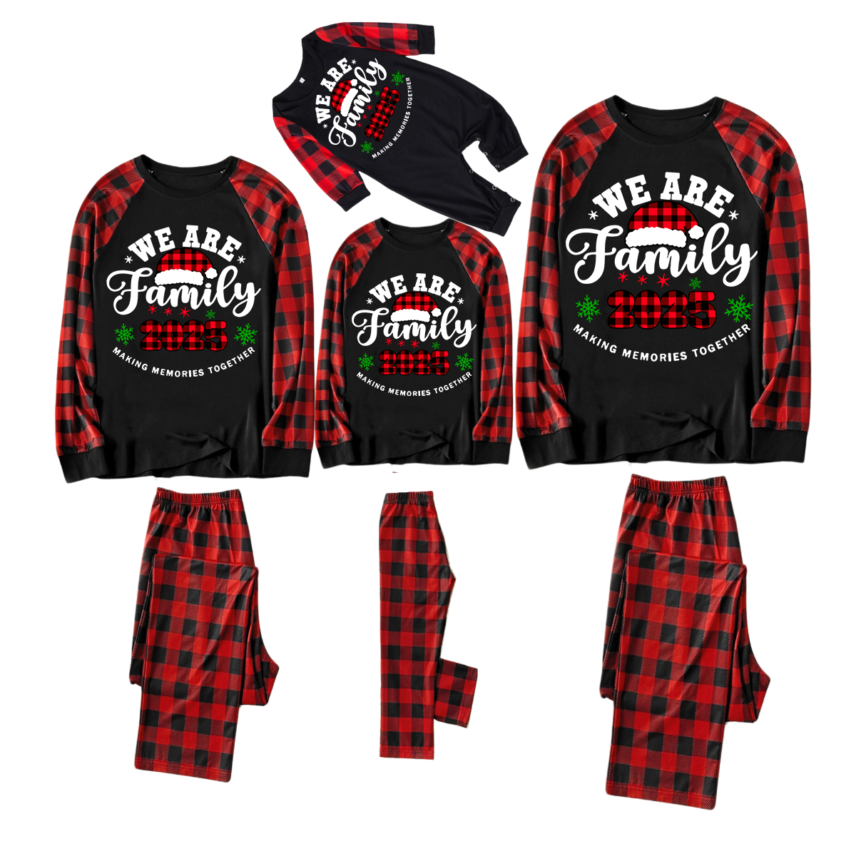 "We are Family2025" Santa Hat Monogram Print Letter Black & Red Plaid Family Matching Black Pajamas