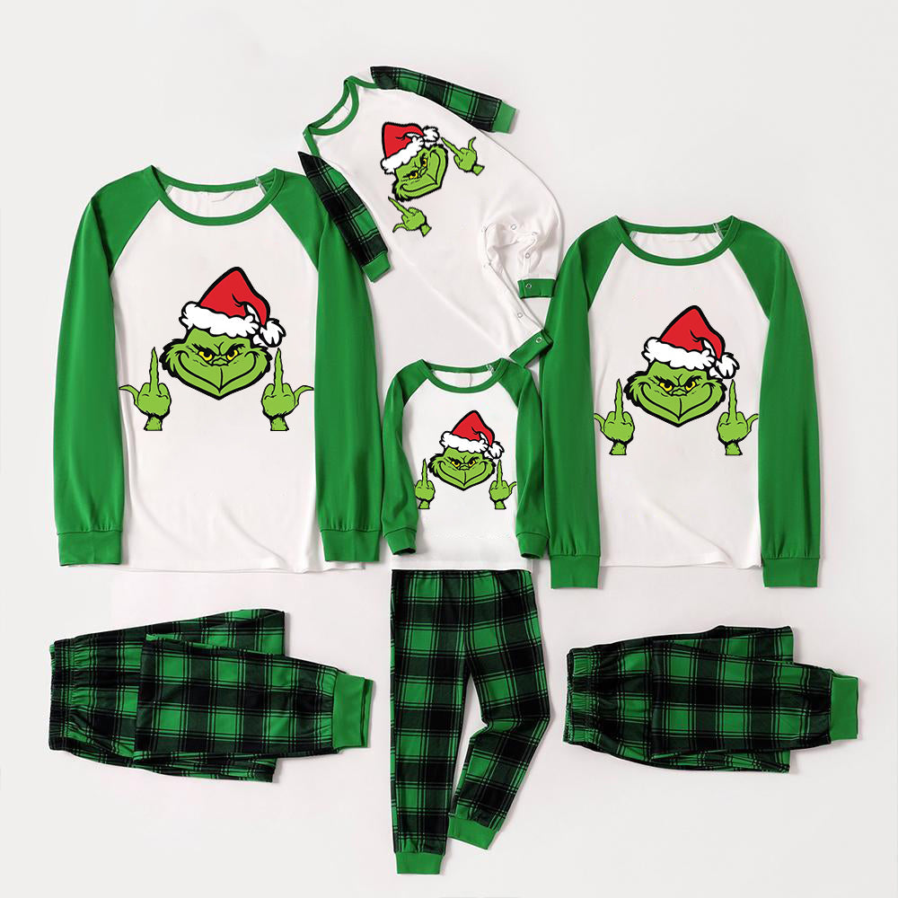 "Merry Christmas" Letter Print 2025 Green Elf Cartoon Pattern Contrast White Long Sleeve with Classic Red and Green Plaid Pants Family Matching Pajamas