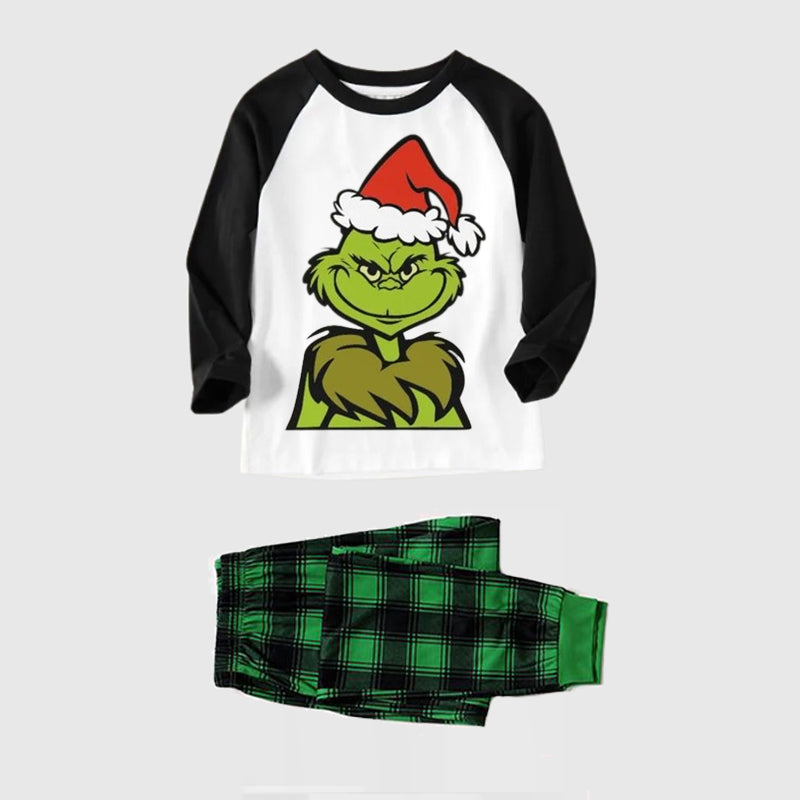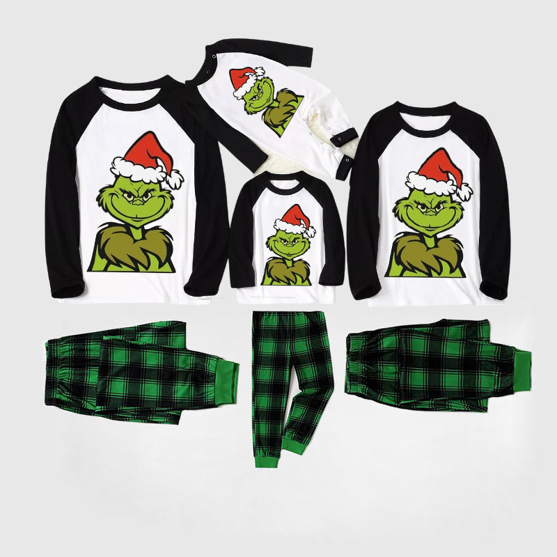 Christmas Hat Cartoon Print Splice Contrast Top and Black and Green Plaid Pants Family Matching Pajamas Sets