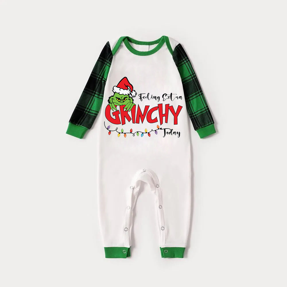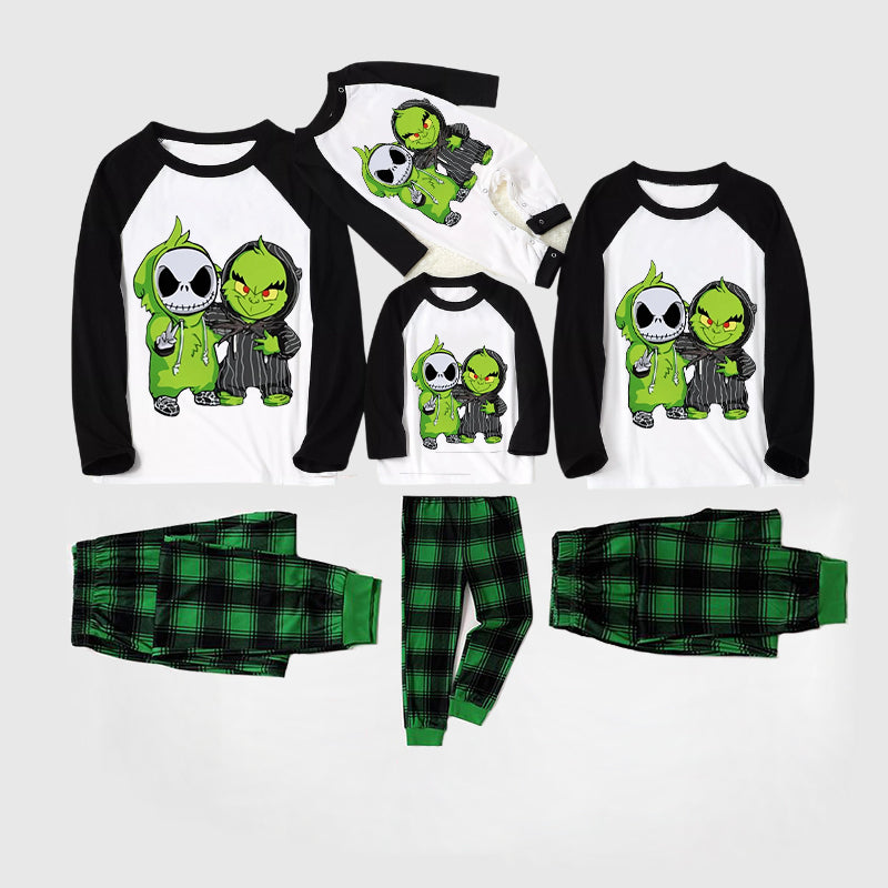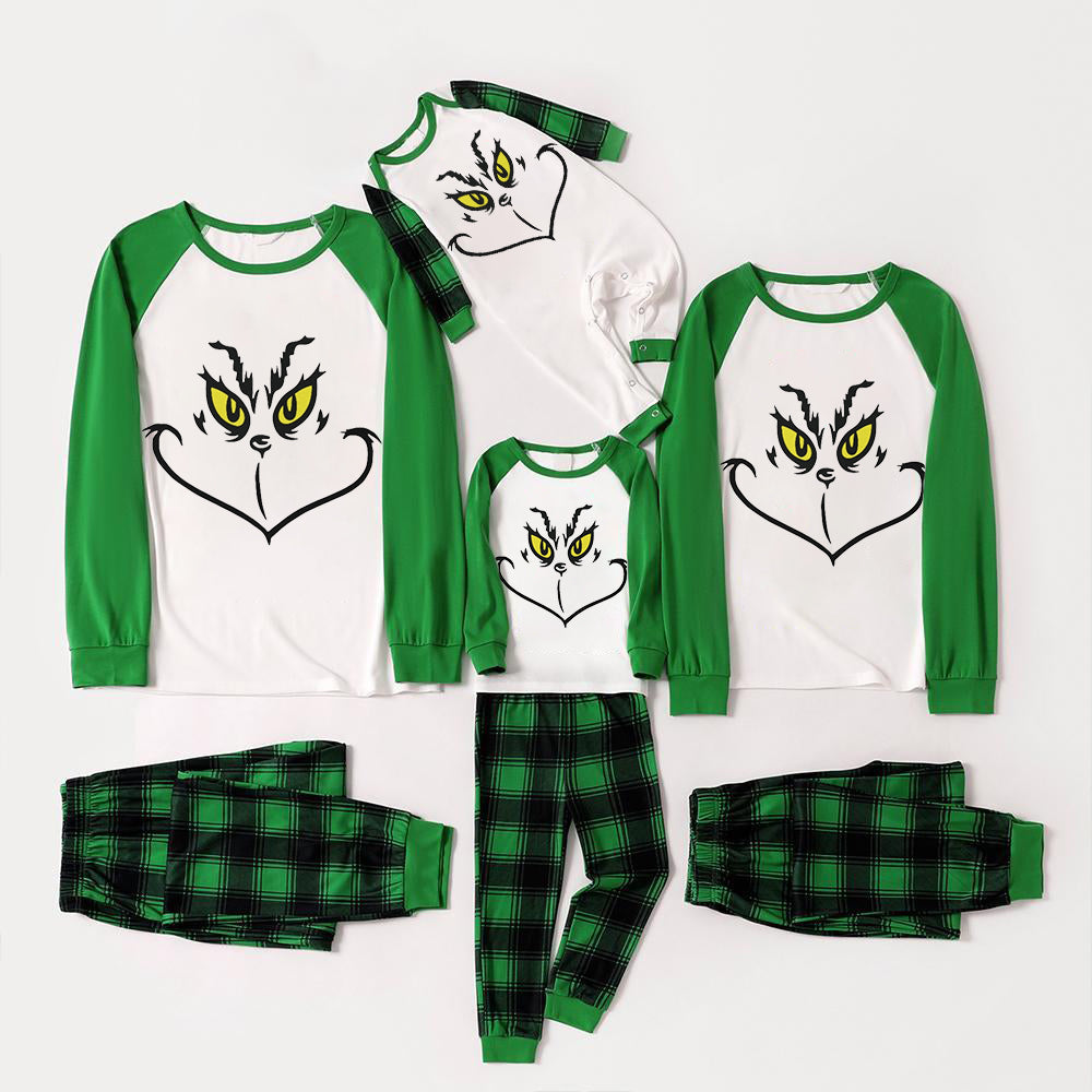 Christmas Cute Cartoon Print Print Splice Contrast Top and Black and Green Plaid Pants Family Matching Pajamas Set