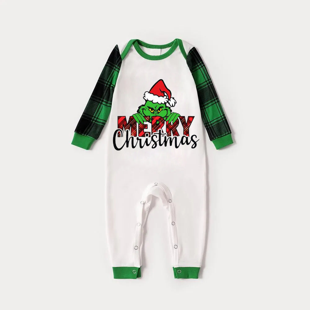 "Merry Christmas" Letter Print 2025 Green Elf Cartoon Pattern Contrast White Long Sleeve with Classic Red and Green Plaid Pants Family Matching Pajamas