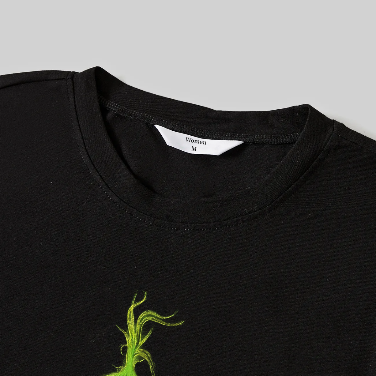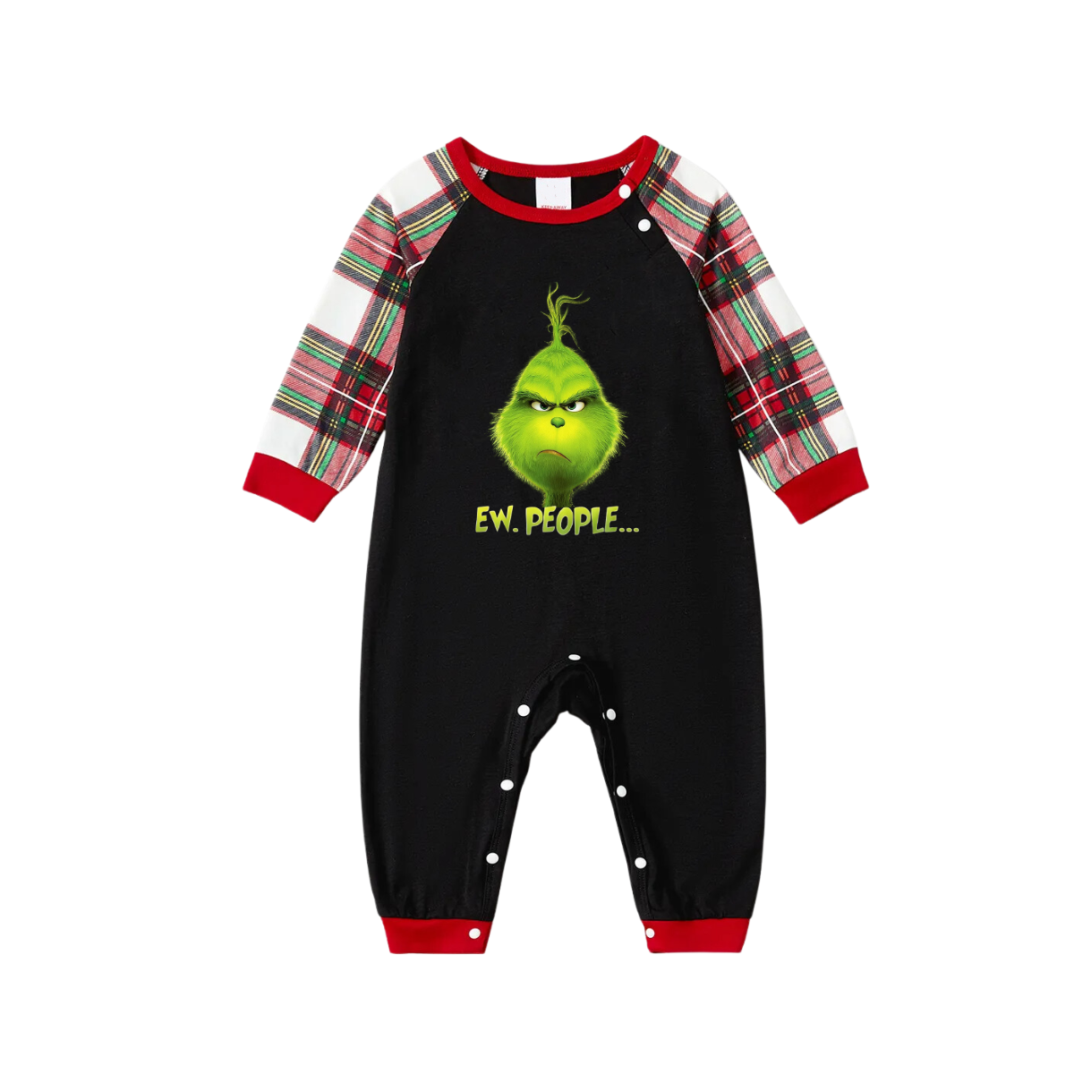 Christmas Cartoon Pattern Print Black Long Sleeve Top with Red & White & Green Plaid Matching Family Pajamas