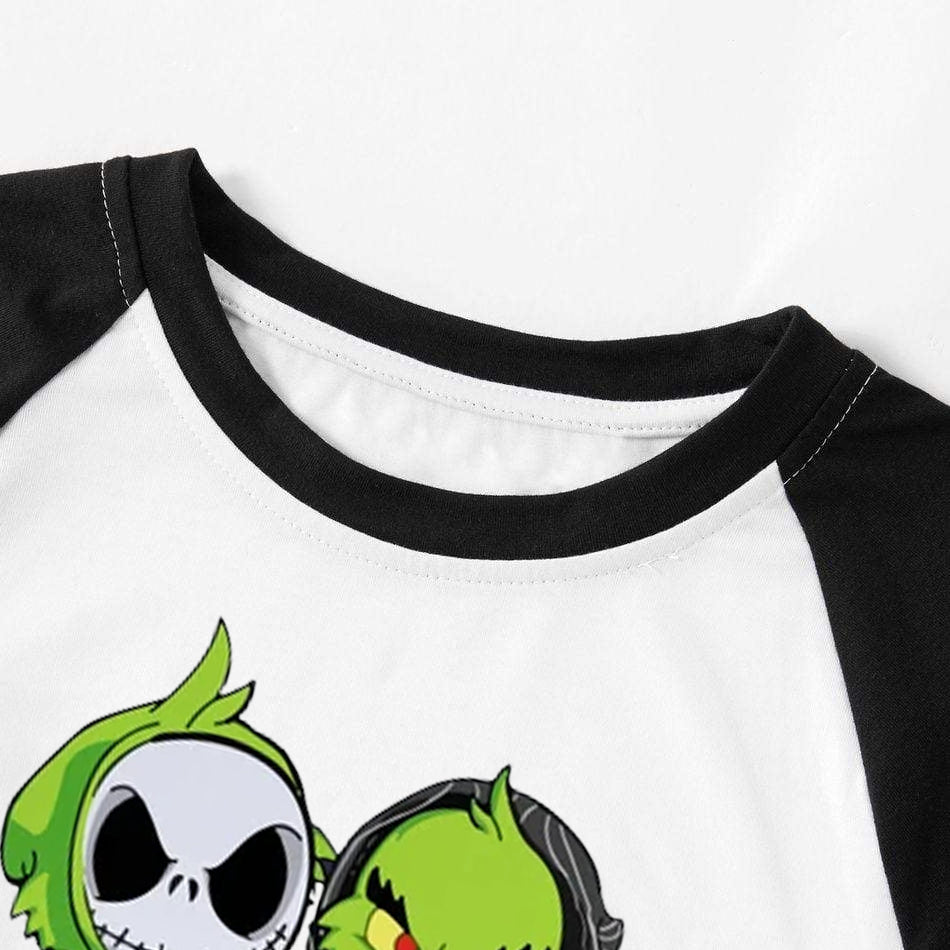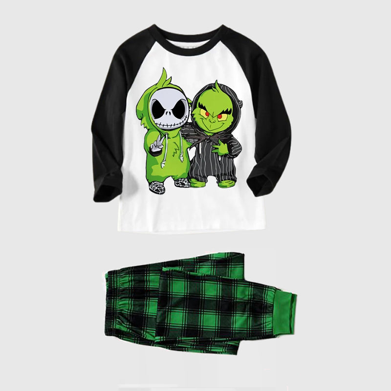 Christmas Cartoon Print Print Splice Contrast Top and Black and Green Plaid Pants Family Matching Pajamas Sets