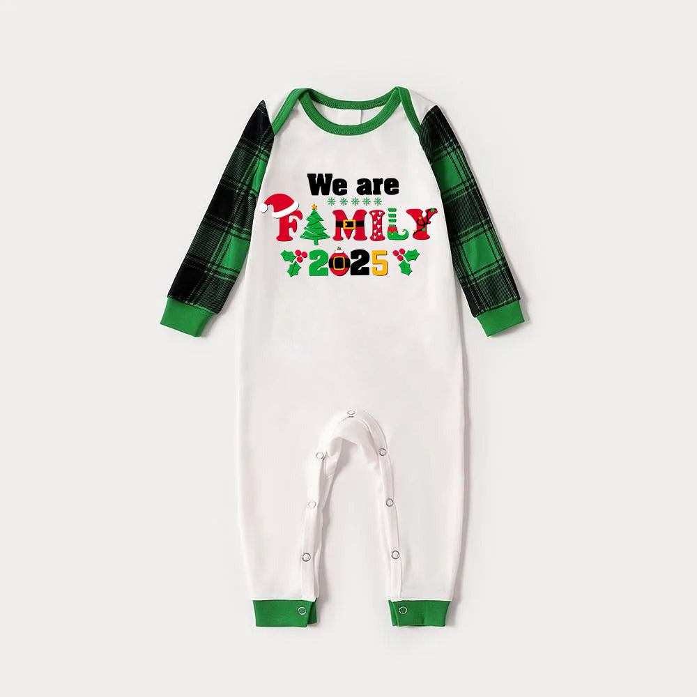 Christmas We are Family 2025 Letter Print Green Rotator Cuff Top With Green & Black Plaid Family Matching Pajamas